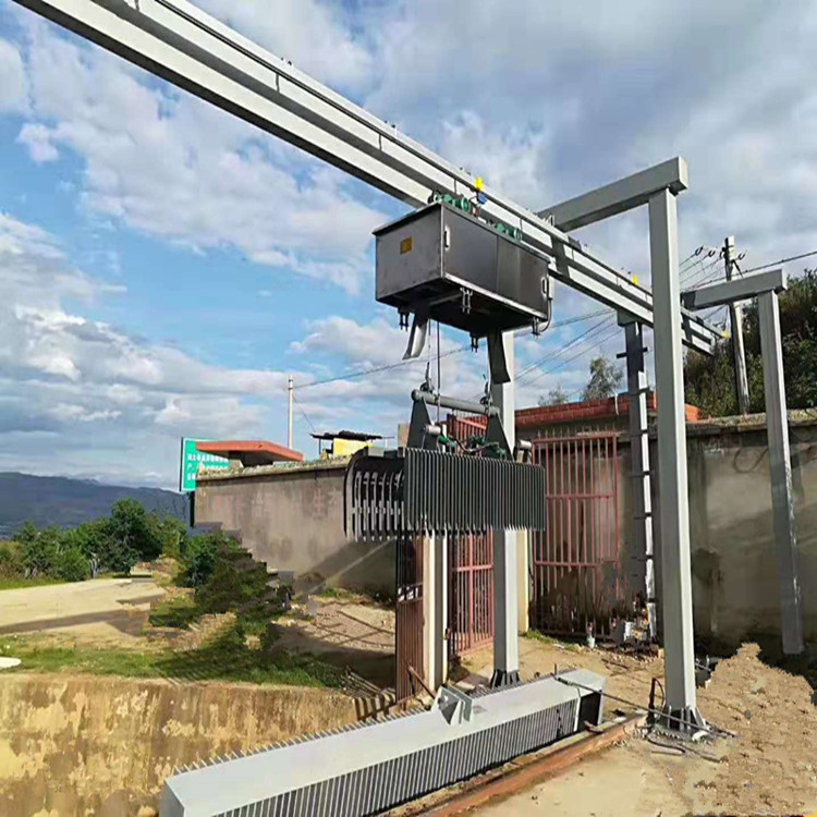 移動(dòng)式格柵清污機(jī)結(jié)構(gòu) 移動(dòng)式格柵整機(jī)包括格柵片、機(jī)架、工作平臺(tái)、行走機(jī)構(gòu)、清污機(jī)構(gòu)、翻耙機(jī)構(gòu)、垃圾小車、18kg/m輕軌、過載保護(hù)裝置、鋼絲繩防松裝置及行程控制、電氣控制箱。電源、驅(qū)動(dòng)執(zhí)行結(jié)構(gòu)和控制系統(tǒng)、電控箱等驅(qū)動(dòng)執(zhí)行結(jié)構(gòu)和控制系統(tǒng)位于機(jī)架上,同時(shí)為施工單位提供相關(guān)預(yù)留預(yù)埋件。