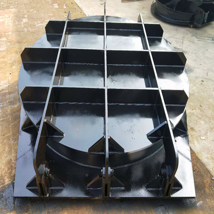 拍門主要由閥體、閥蓋、鉸鏈構件組成,有鑄鐵和碳鋼兩種材質,其啟閉力來自水源壓力,不需人工操作。該拍門內的水壓大于拍門外側壓力,則開啟;反之則關閉,已達到溢流和止回的作用。