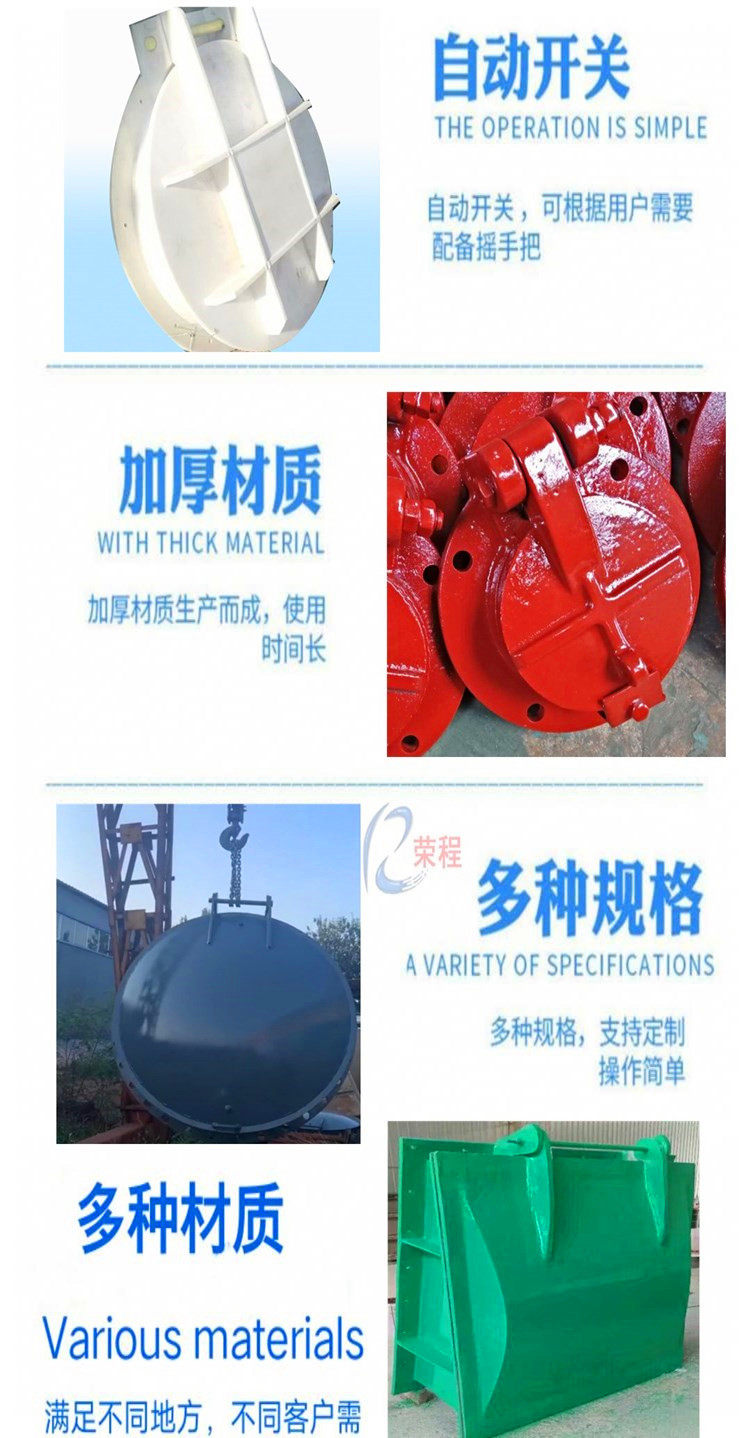 拍門是安裝在給排水和污水處理工程的排水管出口的一種單向閥,用以溢流或止回介質,也可用于各種豎井井蓋。按外形構造分圓型拍門和方型拍門。